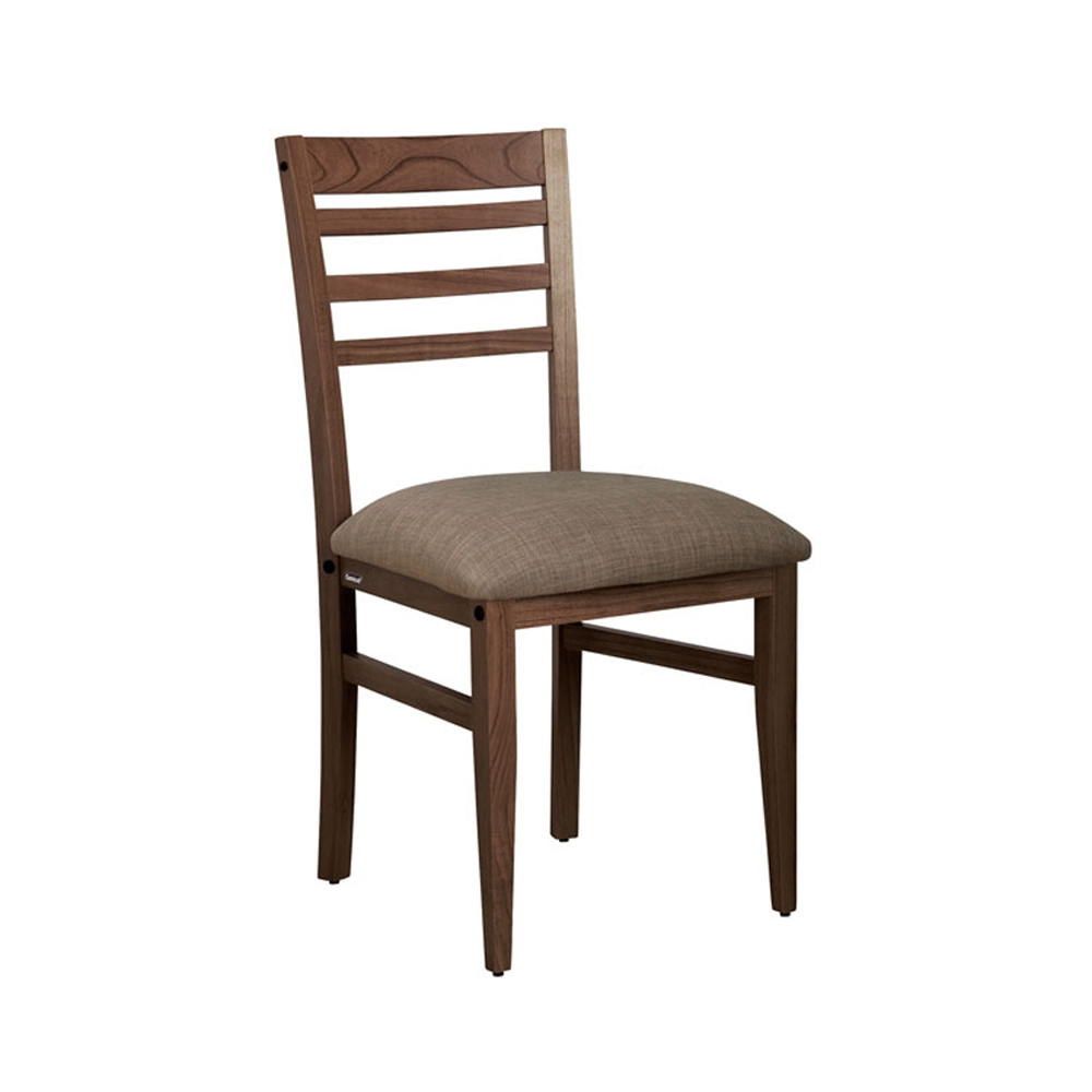 Está fabricada íntegramente en madera maciza de paraíso, con asiento tapizado y respaldo de madera, lo que garantiza comodidad y elegancia.